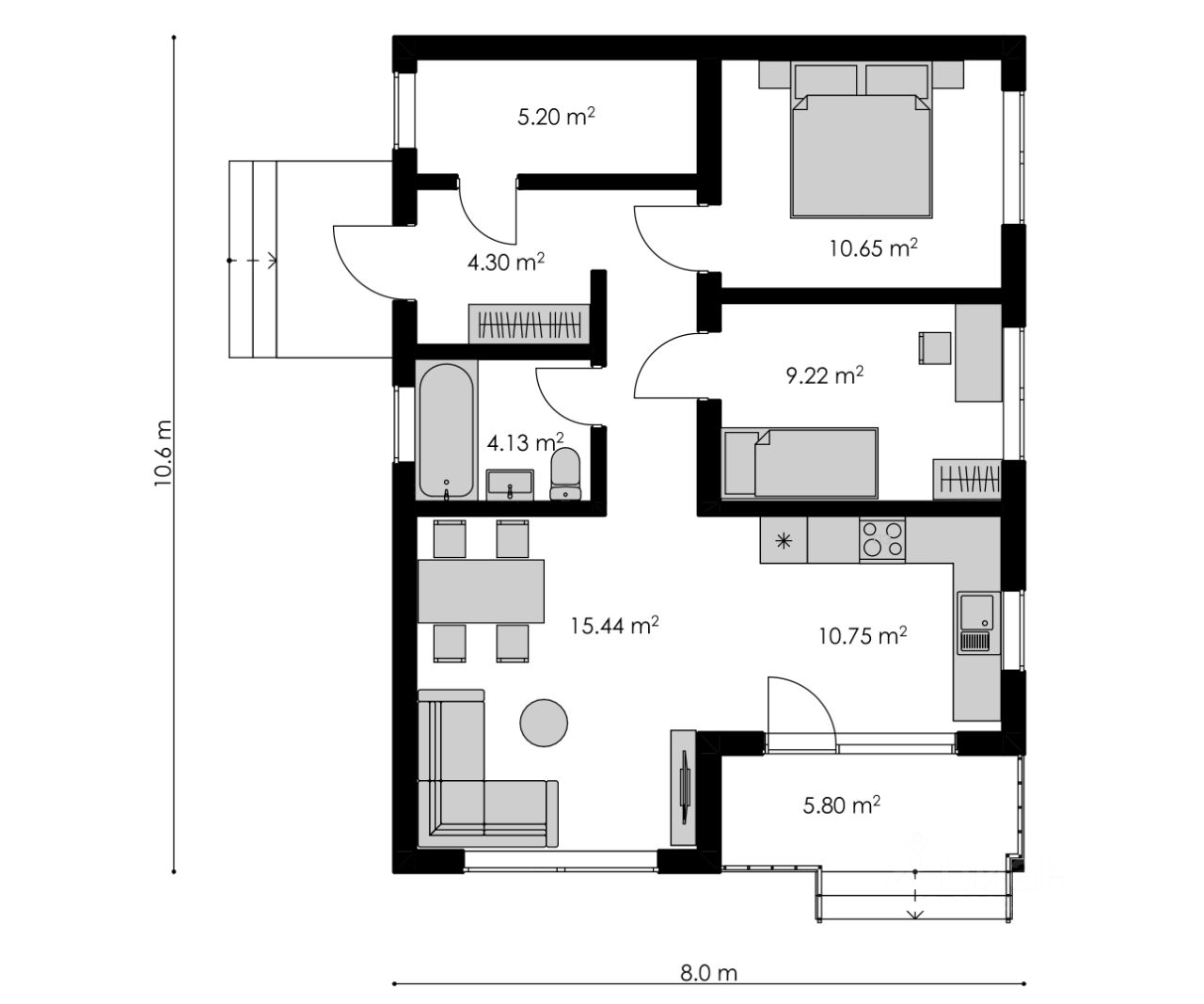 76 м² с террасой - Общая площадь 76 м² - Планировка функциональная: гостиная с обеденной зоной, кухня, 2 спальни, санузел, прихожая - Высокие потолки и большие окна обеспечивают хорошее естественное освещение Терраса и прилегающая территория - Просторная терраса, идеально подходит для утреннего кофе, вечеринок или зоны отдыха - Терраса частично крытая, с возможностью установки мебели и гриля Инженерия и комфорт - Отопление автономное - электрокотёл - Места для парковки рядом с домом