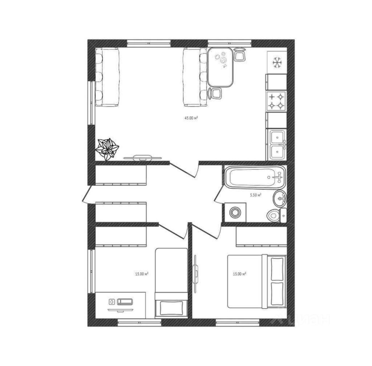 в доме две большие спальни и огромная кухня-гостиная 45 квадратных метров)