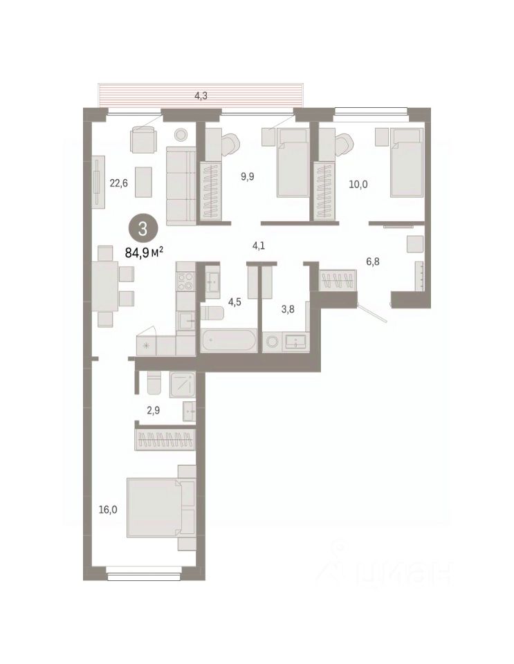 Трехкомнатная квартира от застройщика с предчистовой отделкой в ЖК ''Лебедевский'' на 6 этаже. Общая площадь: 84.9 кв.м. Высота потолков 2.82 м.