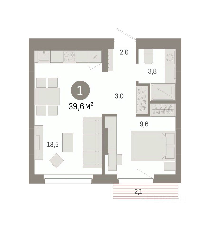 Квартира с кухней-гостиной и одной спальней в квартале ''Лебедевский''. Особенности планировки: балкон, предчистовая отделка. квартиры в нашей базе: ЛБД01.1-Ж4.7.3.
