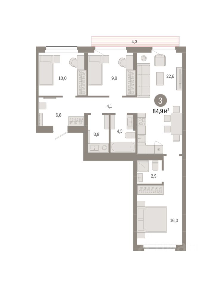 Просторная 3-комн. квартира с предчистовой отделкой в ЖК ''Лебедевский'' на 7 этаже. Общая площадь: 84.9 кв.м. Высота потолков 2.82 м.