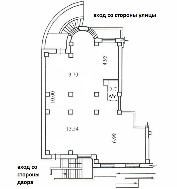 Два входа: со двора и со стороны реки (то есть с улицы). Свободная планировка.