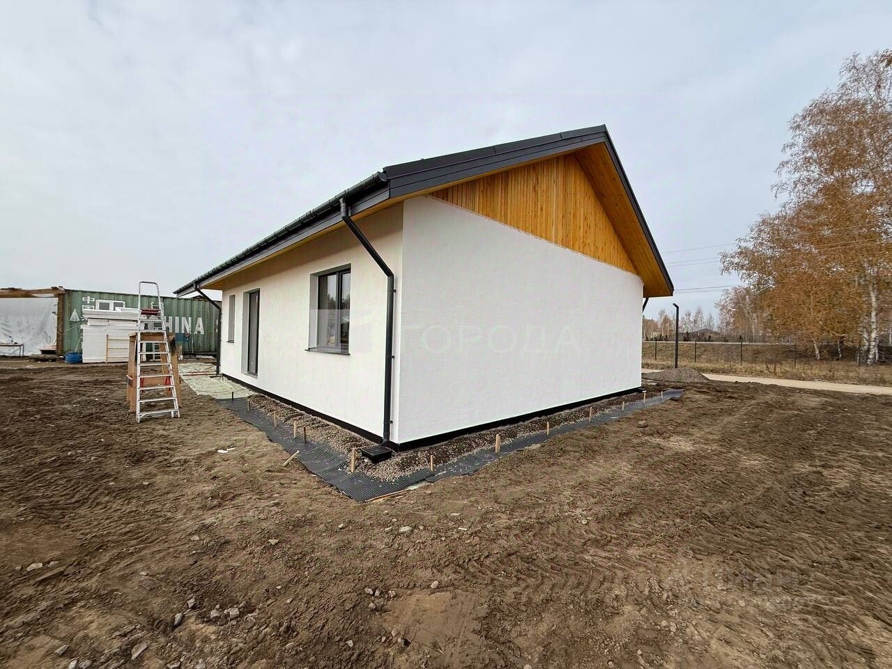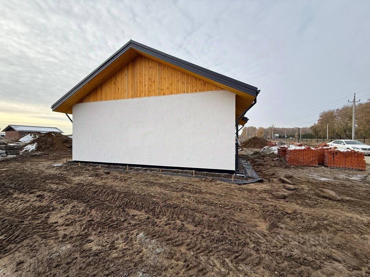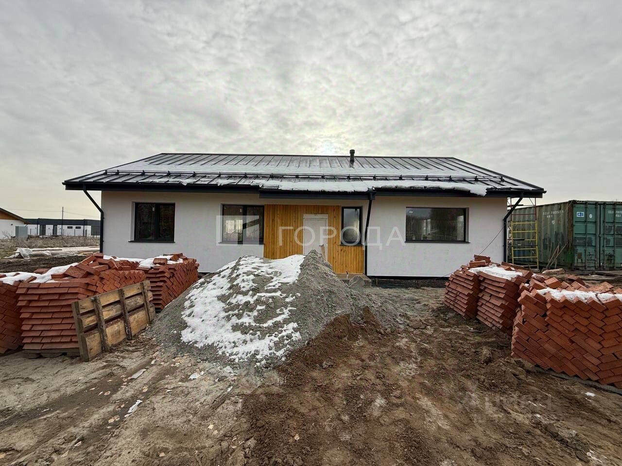 Внутри - предчистовая отделка, включающая в себя устройство отопительной ситсемы посредством теплого пола, разводка сантехники, электрики, оштукатуривание и шпатлевание стен, ввод в дом всех коммуникаций (газ, свет, вода).