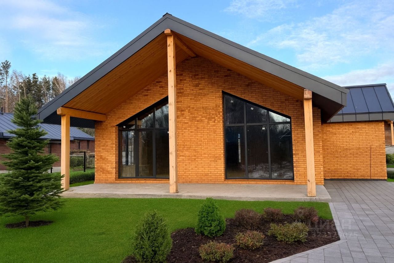 Современный одноэтажный коттедж из кирпича на 10 сотках в клубном поселке Поляна Village. Уютная планировка, просторная веранда, светлый фасад, большие окна и природное окружение — всё создано для комфортной загородной жизни.