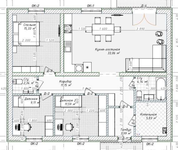 В доме три спальни (15,3 м2, 11, 6 м2, 9,1 м2), два c/y (4,1м2 и 2,4 м2), бойлерная (5.8 м2), просторная кухня гостиная (33 м2).
