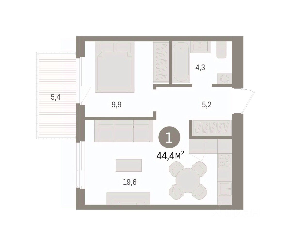 Квартира с кухней-гостиной и одной спальней в жилом районе ''Пшеница''. Особенности планировки: балкон, предчистовая отделка. квартиры в нашей базе: ПШЦ05.2-Ж2.6.3.