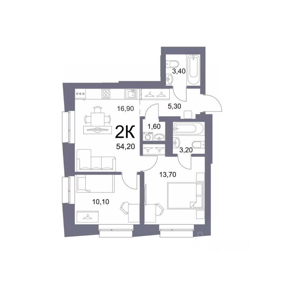 Общая площадь54,2 м2