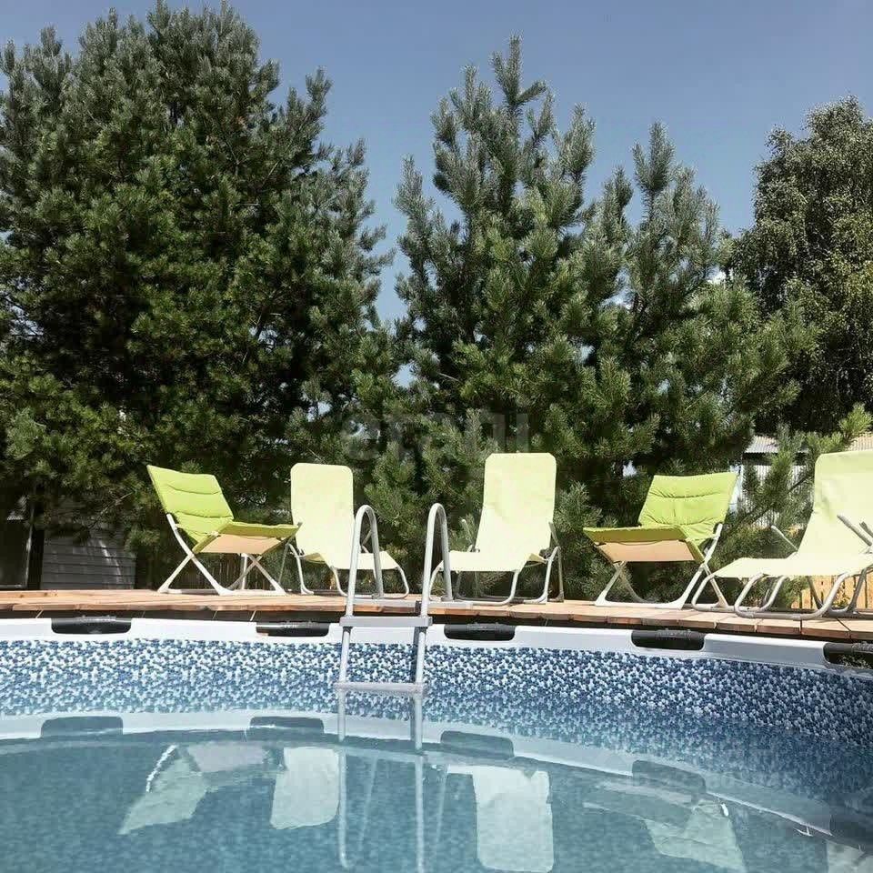 На территории также находится обшитый каркасный бассейн с зоной для лежаков, кедровая баня-бочка и горячая купель Фурако — идеальное место для отдыха и релаксации. Для хранения садового инвентаря предусмотрен хозблок.
