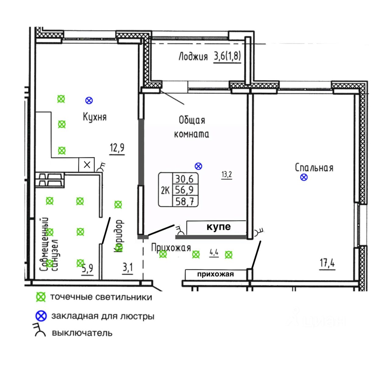 Общая площадь58,7 м2