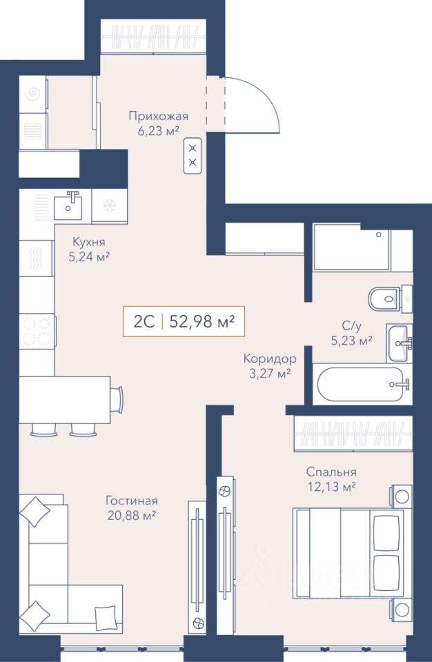 Общая площадь53,4 м2