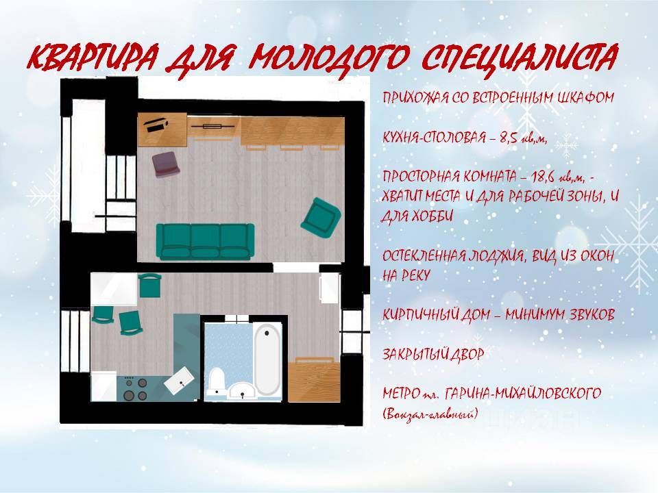 Площадь квартиры 37 кв.м., плюс площадь лоджии 2,8 кв.м.