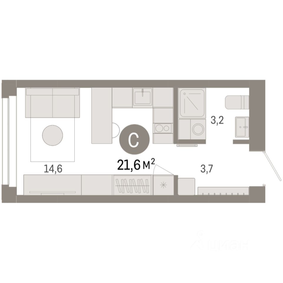 Просторная 1-комн. студия с предчистовой отделкой в Микрорайон ''Европейский Берег'' на 3 этаже. Общая площадь: 21.56 кв.м., площадь гостиной 14.6 кв.м., из которых 5 кв.м. выделено под кухонную зону. Все окна выходят на одну сторону. В квартире один совмещенный санузел. Высота потолков 2.7 м.