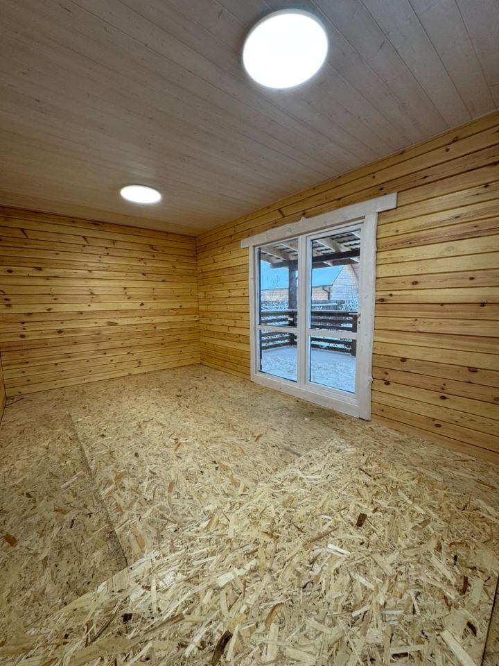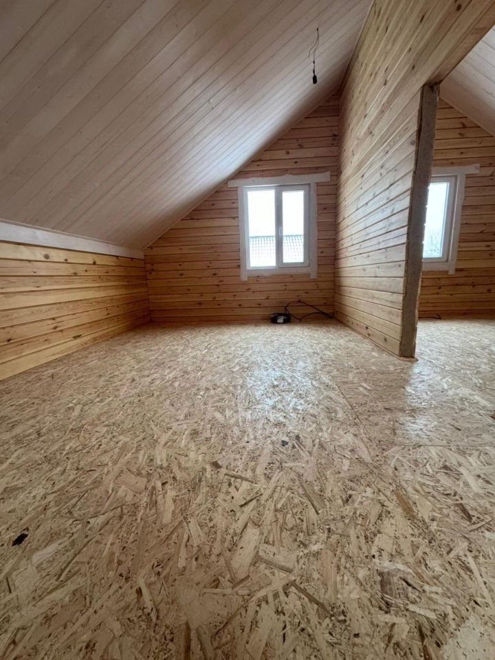 Экологически чистый материал: брус гарантирует здоровую атмосферу и приятный микроклимат круглый год. Отделка потолков вагонкой. Высота потолков 2.7м на 1 этаже, 4м на 2 этаже. Стены внутри и снаружи дома отшлифованы и окрашены краской. Удобная планировка: первый этаж оснащен просторной кухней-гостиной с панорамным остеклением и выходом на террасу, спальней, санузлом и хозяйственным помещением. Дополнительные удобства: второй этаж с двумя спальными комнатами свободной планировки.