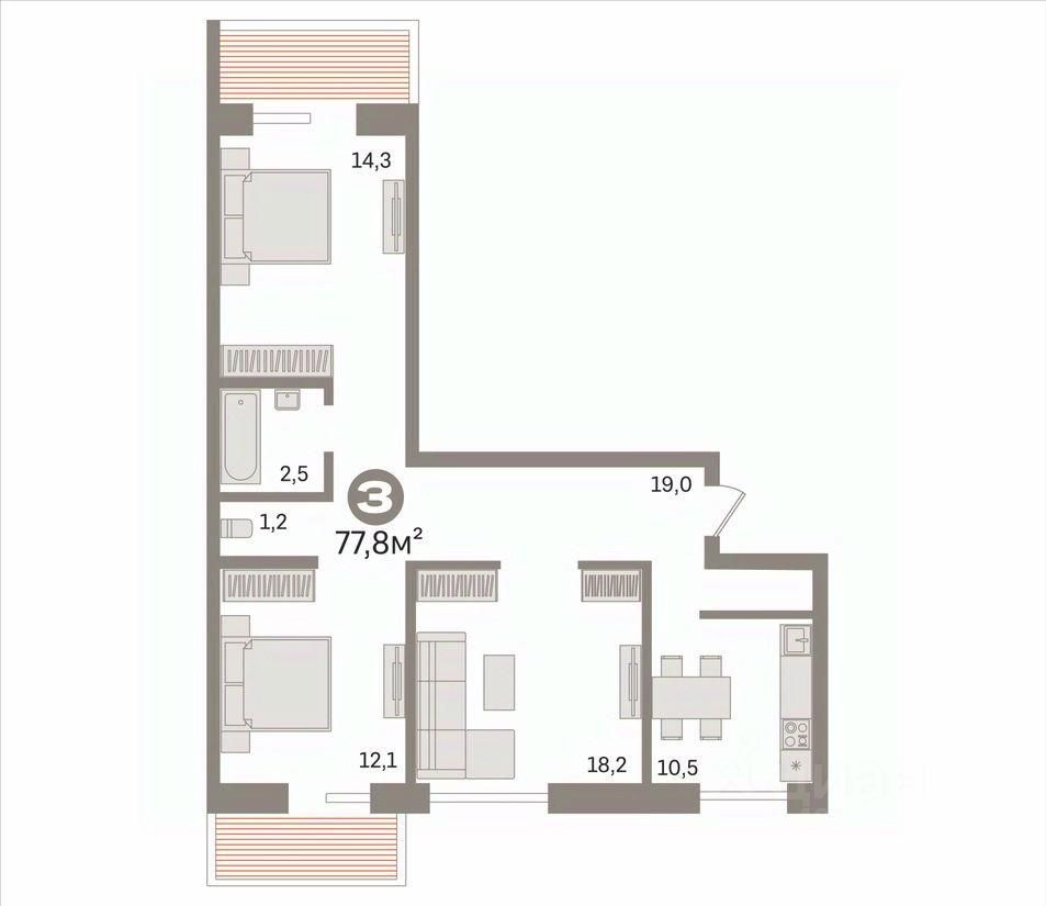 Трехкомнатная квартира площадью 77,8 кв.м.
