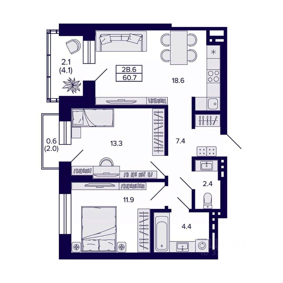Общая площадь60,7 м2