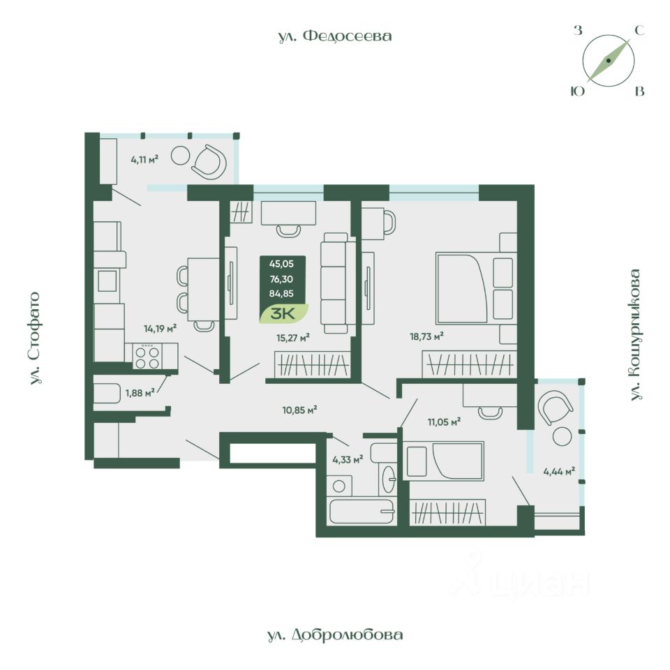 Общая площадь84,85 м2