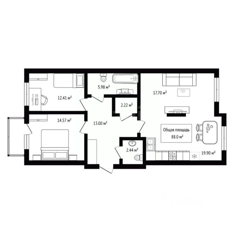 Главные преимущества: - Просторная кухня 20 м² — идеальное место для семейных ужинов и вечеринок с друзьями - Грамотная планировка с изолированными комнатами: - Гостиная 17,7 м² — пространство для отдыха и развлечений - Спальня 12,4 м² — ваша зона спокойствия и уюта - Детская 14,6 м² — достаточно места для игр и развития - Два санузла — комфорт для всей семьи - Отдельная прачечная — продуманное решение для организации быта