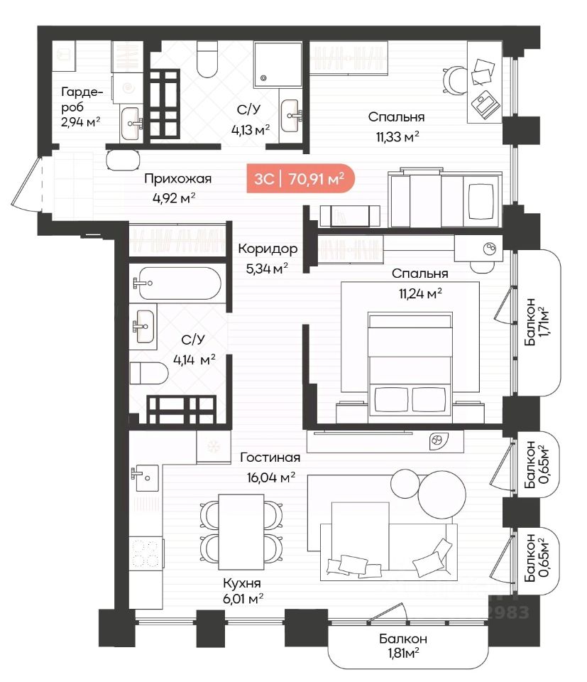 Общая площадь70,91 м2
