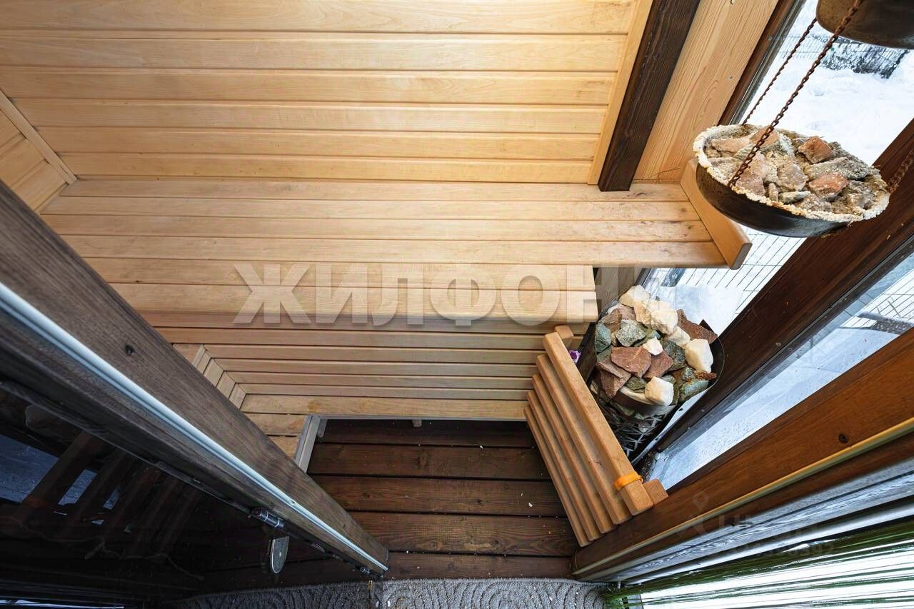На участке расположена большая веранда с собственной сауной. Парилка построена с особым вниманием, камни привезены с Байкала - плотные вулканические породы, которые долго держат тепло, дают мягкий пар и при нагреве выделяют полезные минералы, создавая лёгкий оздоровительный эффект.