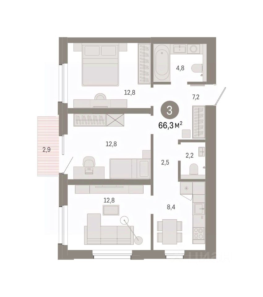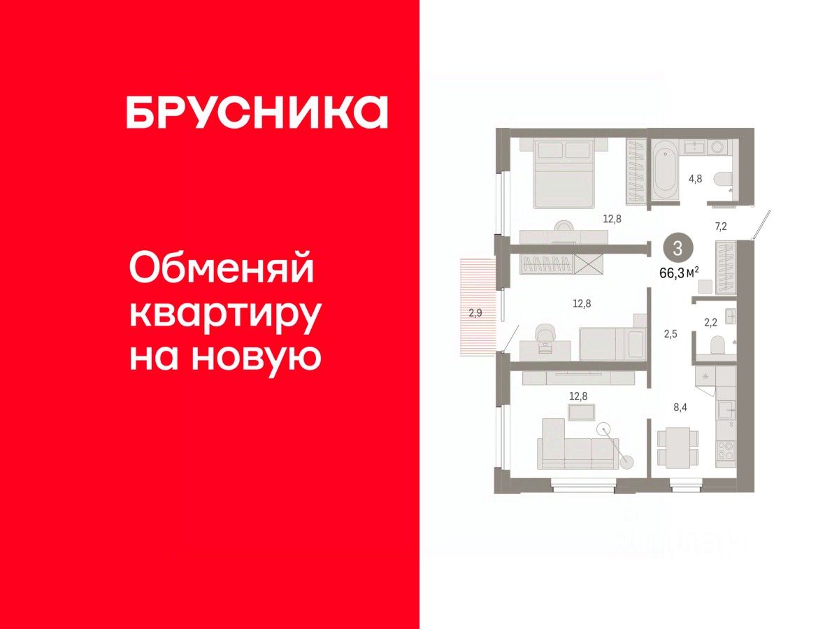 Квартира с кухней-гостиной и тремя спальнями в проекте Город-на-озере. Особенности планировки: балкон, предчистовая отделка, разнесённые спальни. квартиры в нашей базе: ГРД01-Ж5.5.3.