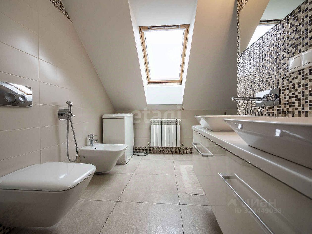 180 м кв жилой площади. В доме два жилых этажа и цоколь. На первом этаже дома (95 м кв) огромная кухня-гостиная, санузел, гардеробная, лестница на второй этаж. На втором мансардном этаже 3 спальни, гардеробная, санузел, площадь второго этажа 95 м кв, в ванной комнате второго этажа окно. Цокольный этаж не используется.