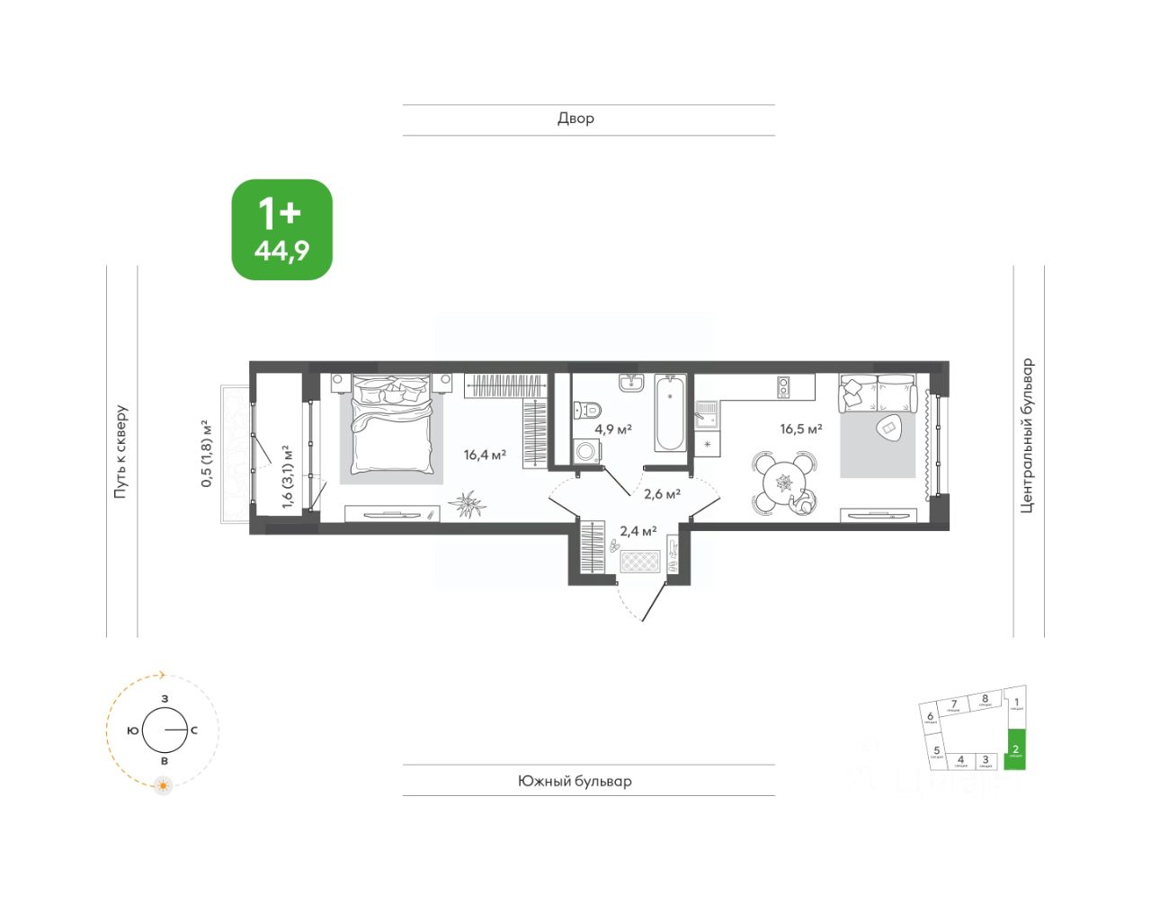 Спальня с выходом на лоджию и экстра-балкон с вместительной зоной хранения, которая может быть превращена в гардеробную — уголок комфорта и уединения.
