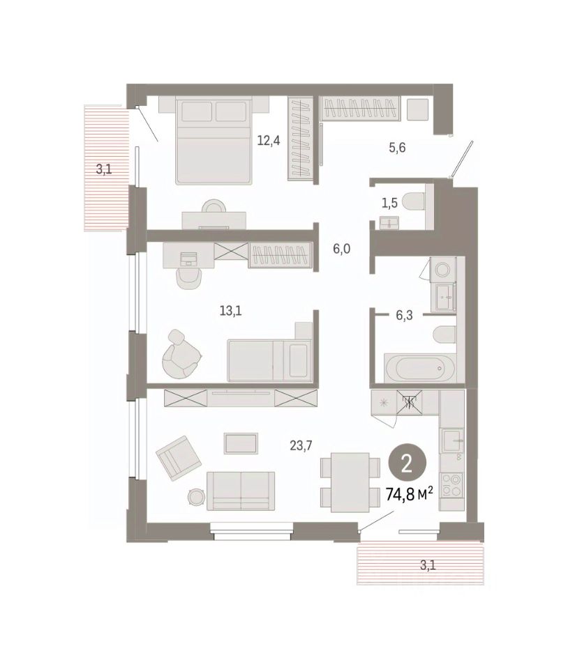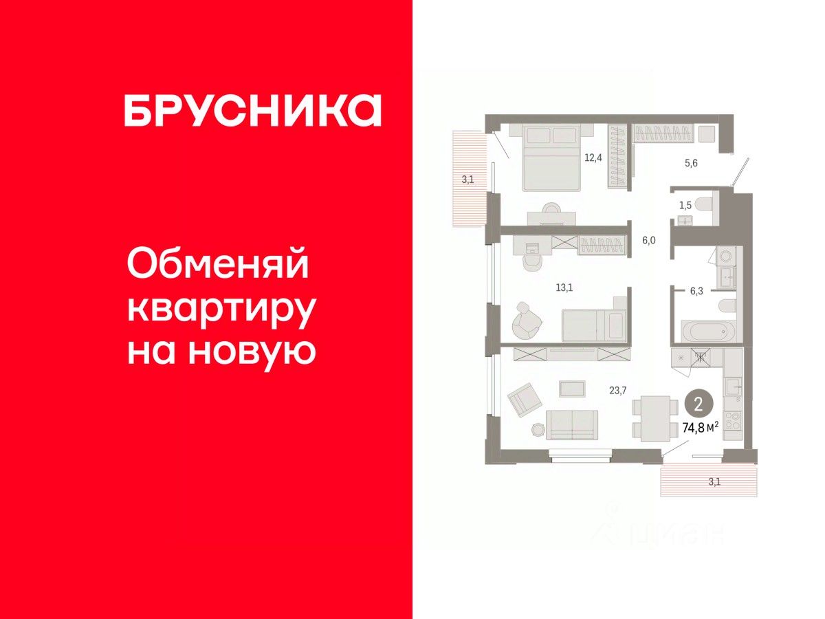 Квартира с кухней-гостиной и двумя спальнями в проекте Город-на-озере. Особенности планировки: балкон, предчистовая отделка, разнесённые спальни. квартиры в нашей базе: ГРД01-Ж1.6.4.