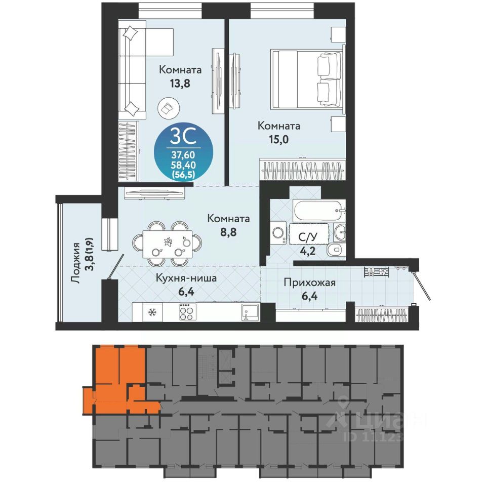 Общая площадь56,5 м2