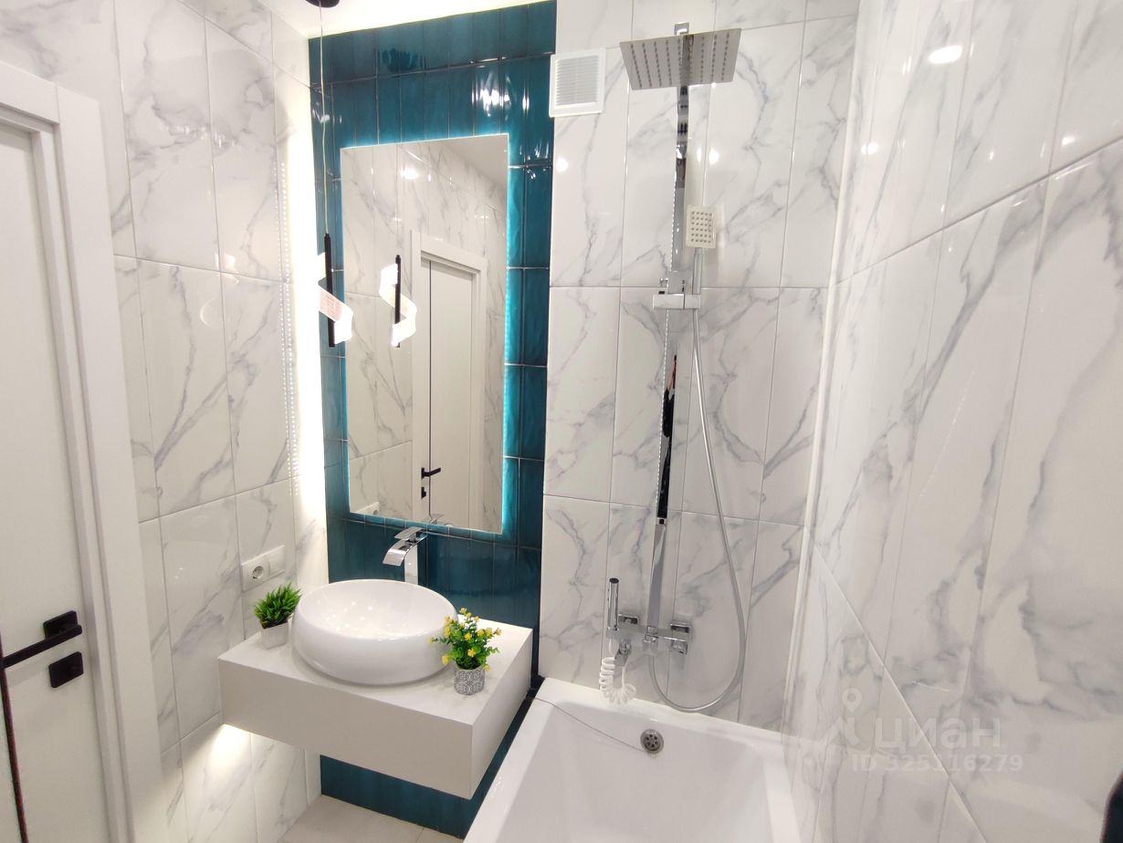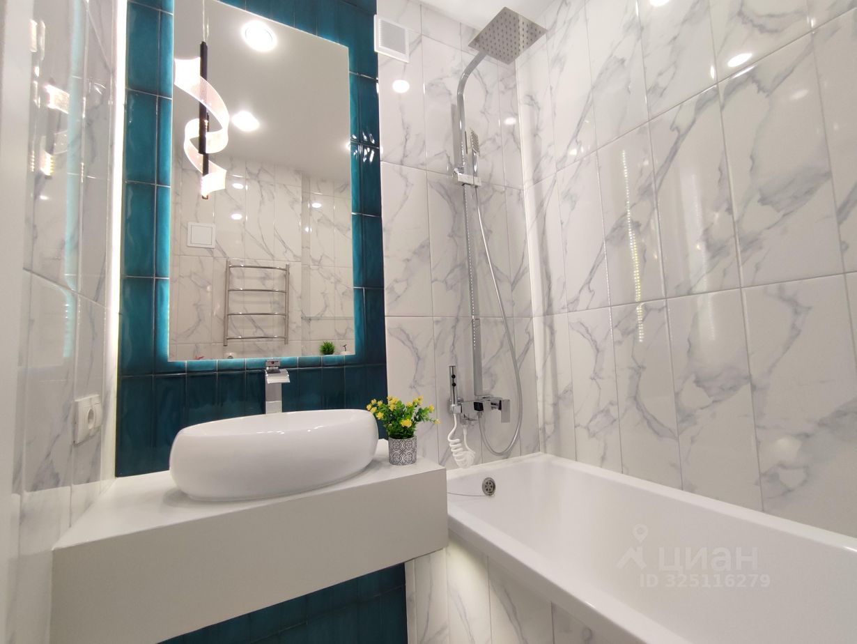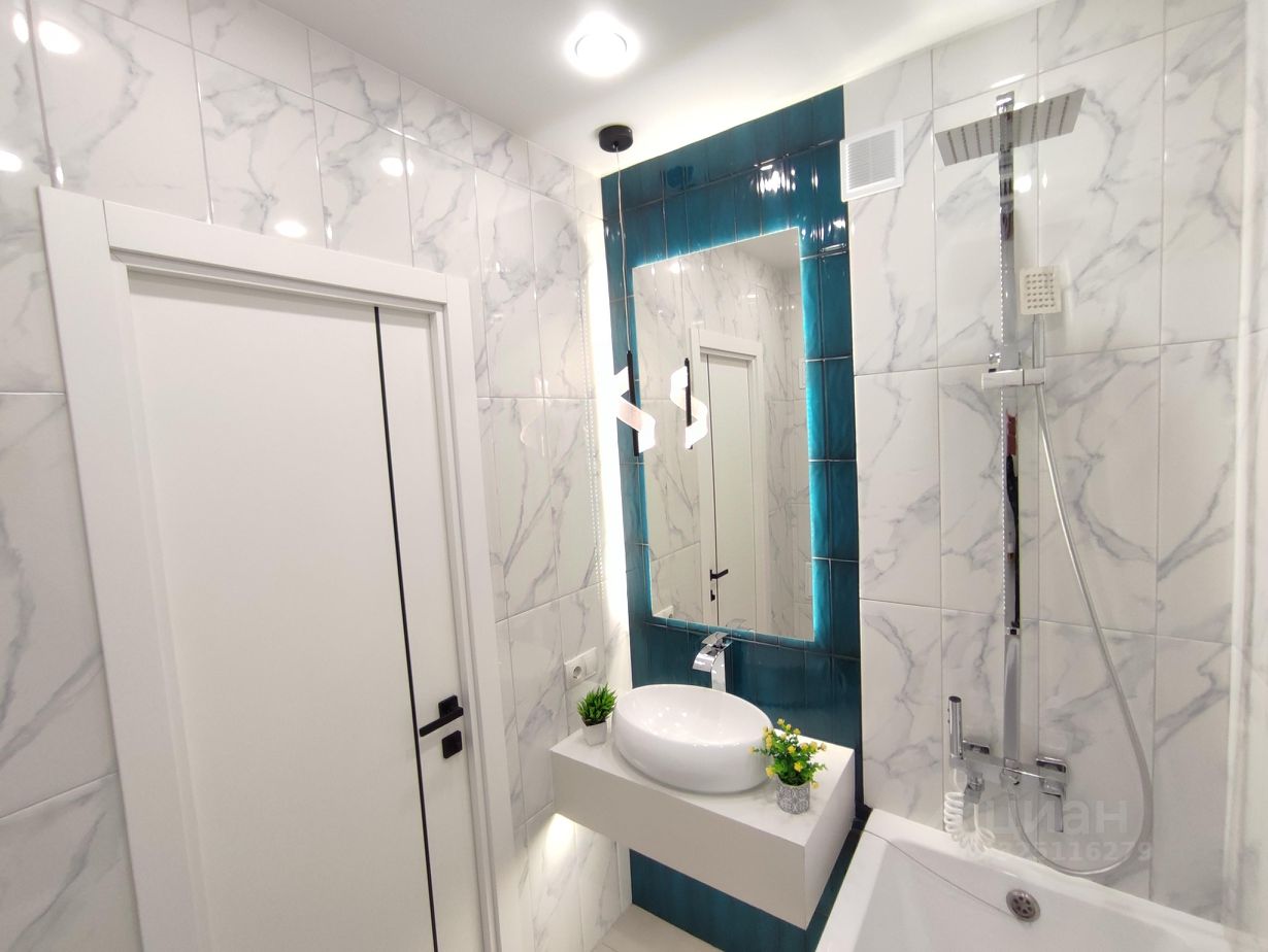 -Современная сантехника: инсталляция, безободковый унитаз, раковина-чаша, высокий смеситель-водопад, современная душевая стойка, гигиенический душ. Электрический полотенцесушитель скрытого монтажа. -Запилы всех углов под 45 градусов. - В качестве акцента в ванной - большое зеркало с подсветкой и декоративным светильником. Квартира яркая, стильная, заряженная на позитив и комфортную жизнь! Окна выходят на юго-запад.