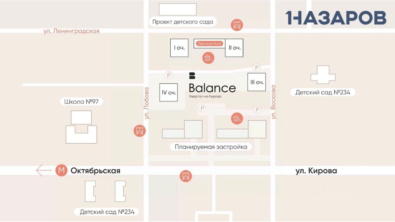 Всего за 10 минут на автомобиле можно добраться до станции метро ''Октябрьская'', а путь до центра города занимает 1520 минут. В перспективе, согласно генплану развития города, время в пути сократится благодаря расширению улицы Кирова.