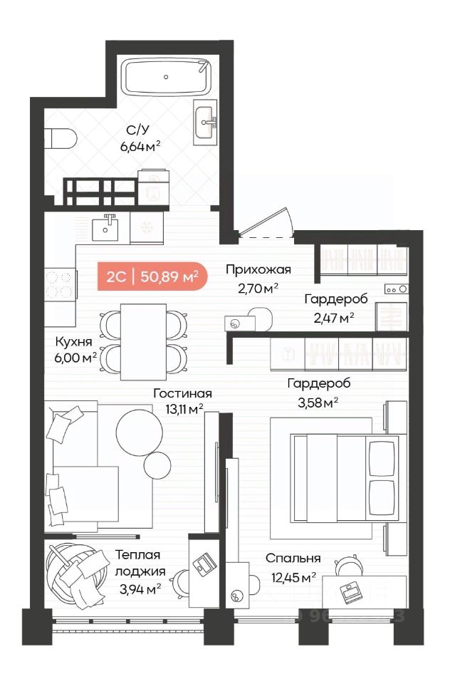 Общая площадь50,89 м2