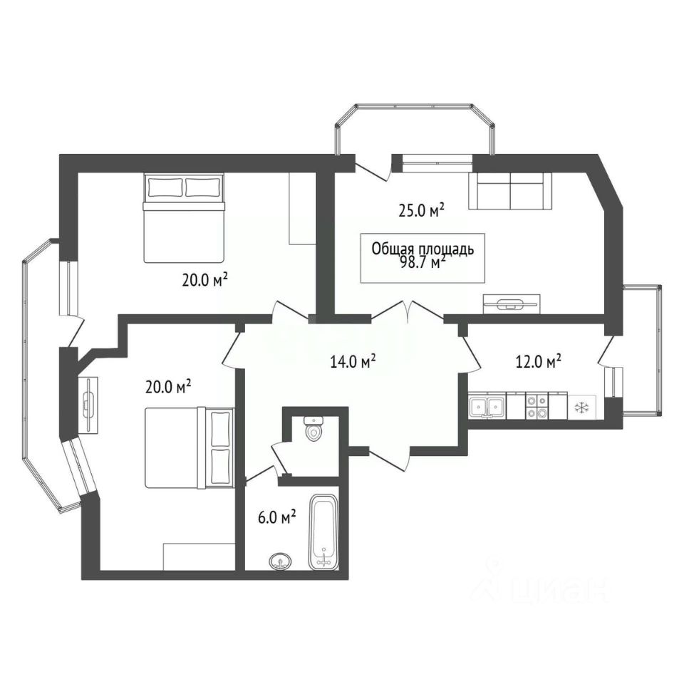 Общая площадь 98,7 кв.м: кухня-12 кв.м зал - 25 кв.м спальни две - по 20 кв.м коридор - 14 кв.м ванная - 6 кв.м