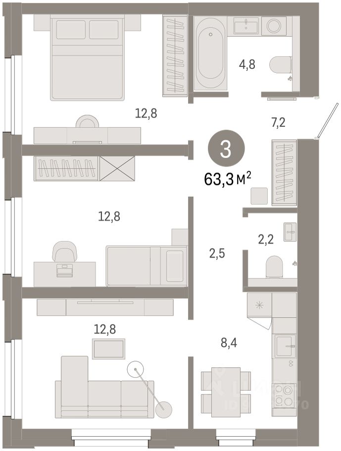 Квартира с кухней-гостиной и тремя спальнями в проекте Город-на-озере. Особенности планировки: новые лоты, предчистовая отделка, разнесённые спальни. квартиры в нашей базе: ГРД01-Ж5.7.3.