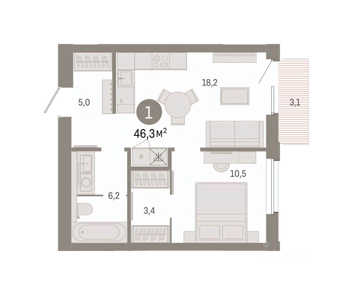 Квартира с кухней-гостиной и одной спальней в проекте Город-на-озере. Особенности планировки: балкон, новые лоты, предчистовая отделка. квартиры в нашей базе: ГРД01-Ж1.7.8.