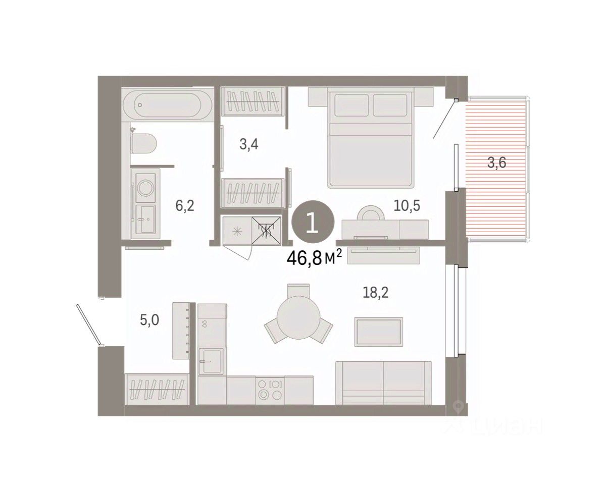 Квартира с кухней-гостиной и одной спальней в проекте Город-на-озере. Особенности планировки: балкон, новые лоты, предчистовая отделка. квартиры в нашей базе: ГРД01-Ж1.9.1.