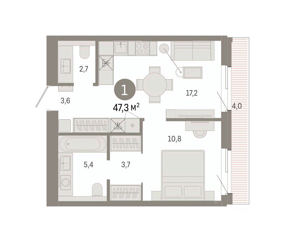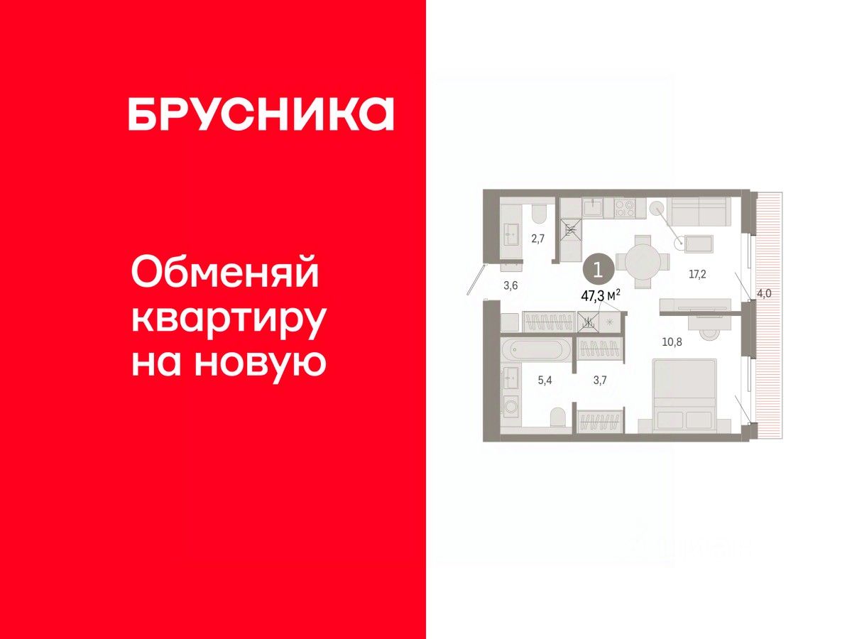 Квартира с кухней-гостиной и одной спальней в проекте Город-на-озере. Особенности планировки: предчистовая отделка, терраса на крыше. квартиры в нашей базе: ГРД01-Ж9.3.2.