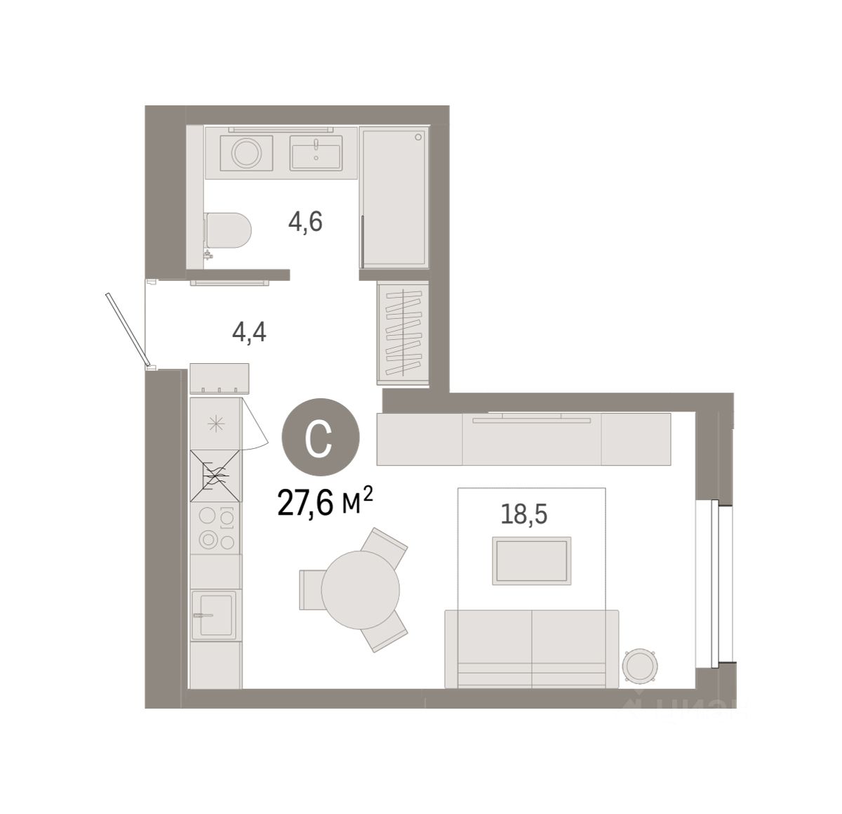 Студия в проекте Город-на-озере. Особенности планировки: новые лоты, предчистовая отделка. квартиры в нашей базе: ГРД01-Ж9.5.4.