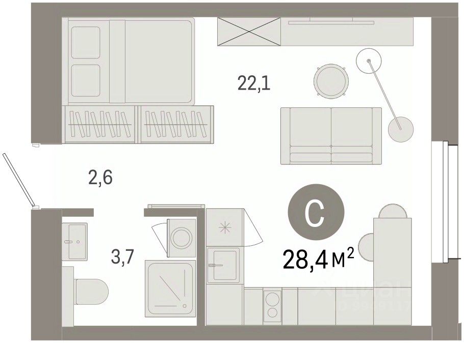 Студия в проекте Город-на-озере. Особенности планировки: новые лоты, предчистовая отделка. квартиры в нашей базе: ГРД01-Ж5.6.1.