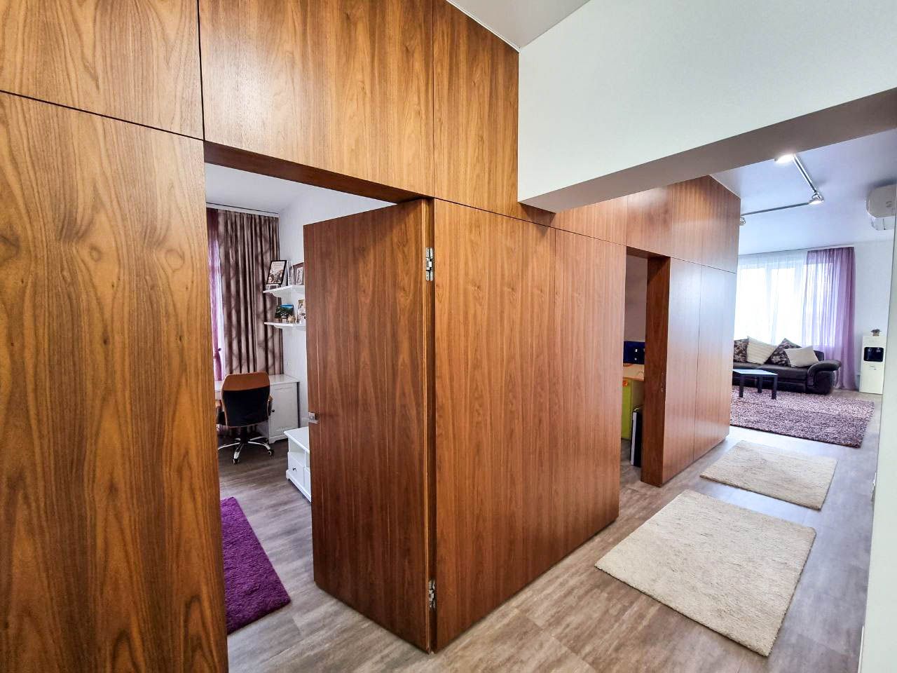 Вся планировка свободная, но с четко выраженными функциональными зонами и продуманными визуальными и функциональными взаимосвязями: кухня-столовая с выделенной обеденной зоной + гостиная, включая lounge-zone в восточном стиле и глубоким низким диваном в эркере, с панорамным видом на лесные массивы, сделаны максимально общественными — для активного времяпрепровождения днём, приготовления и приёма еды, разнообразного отдыха и приёма гостей. Блок спальни хозяев сделан максимально приватным и семейно-кулуарным. Также в квартире есть две детские комнаты. Ванная комната состоит из большой ванны, туалета с биде. Гостевой санузел с душем. Отдельная бытовая комната, 2 гардеробные комнаты, много мест хранения, 2 просторные лоджии с отделкой и остеклением.