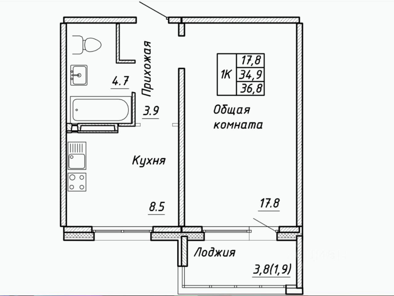 Квартира площадью 36.8 квадратных метров. Высота потолков 2,7 м визуально увеличивает пространство и придаёт лёгкость. Большие окна в квартире и панорамное остекление лоджии создают естественное освещение и открывают вид во двор.