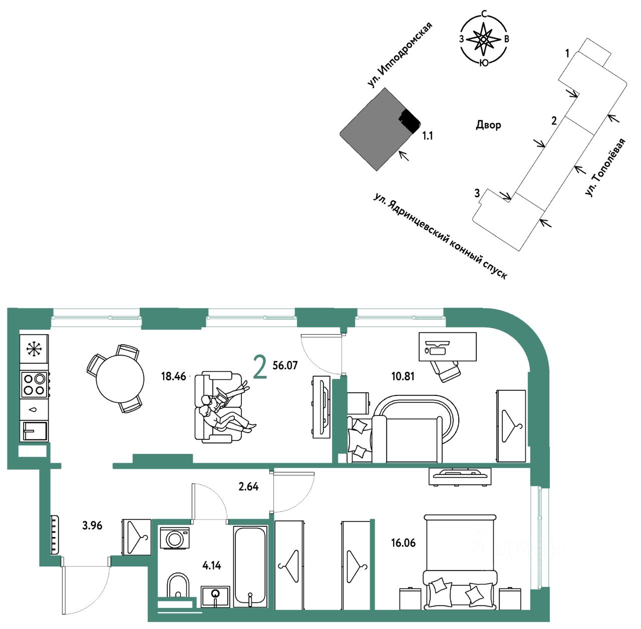 Продается 2комнатная квартира на 14 этаже от застройщика Страна Девелопмент. Площадь квартиры 56,07 кв. м.