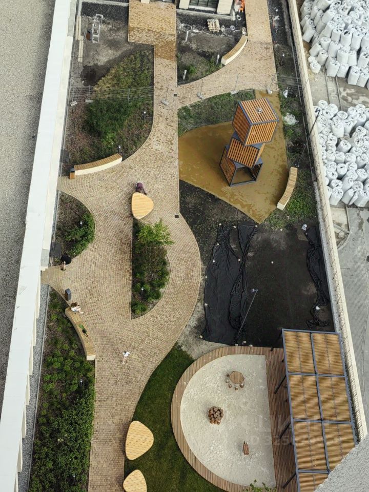 Придомовая территория оснащена современными качелями, лаундж-зонами и красивыми растениями и цветами.