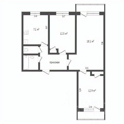 В продаже трехкомнатная квартира 56,2 кв.м., расположенная на третьем этаже пятиэтажного кирпичного дома.