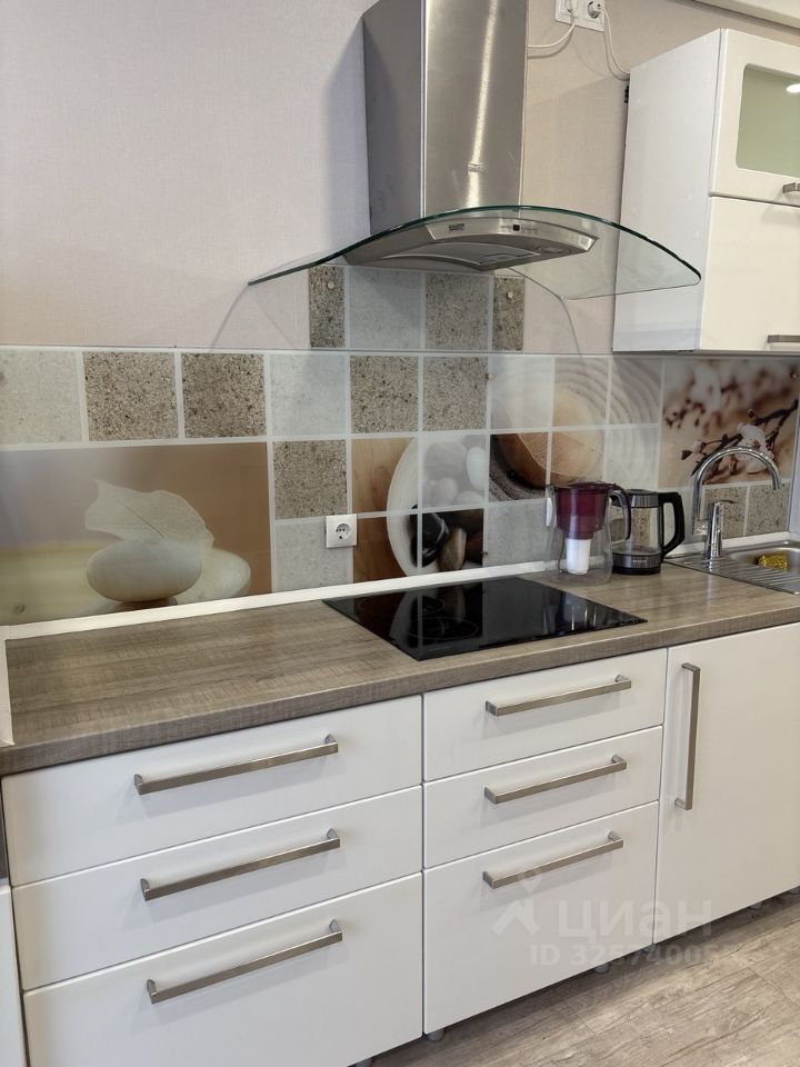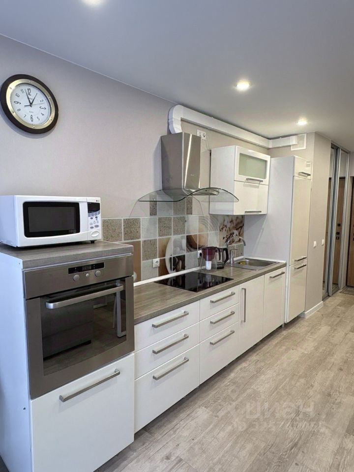 Кухонная зона оснащена полноценной плитой, жарочным шкафом, микроволновкой, встроенным холодильником. Есть посуда, чайник. Новый диван с ортопедическим матрасом может служить полноценным спальным местом для гостей.