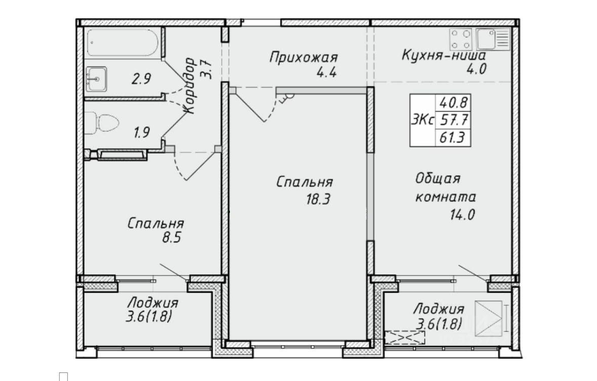 - Планировка: просторная кухня-гостиная + 2 изолированные спальни, 2 лоджии, раздельный санузел