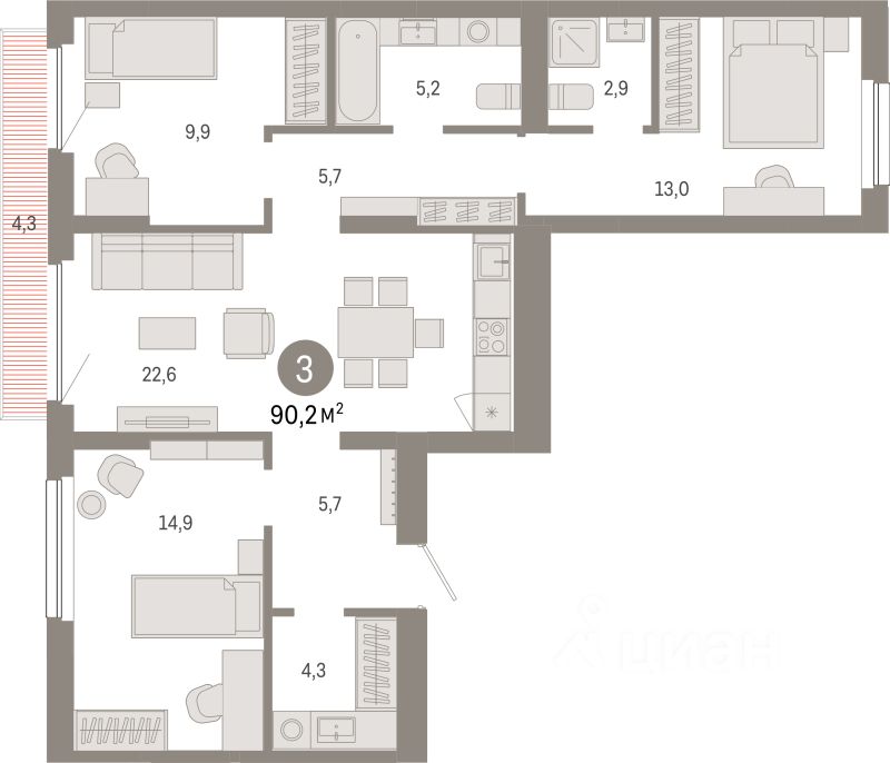 Продаётся 3-комнатная квартира в строящемся доме (Дом 1), срок сдачи: II-кв. 2028, общей площадью 90.2 кв.м., на 5 этаже. ''Квартал Лебедевского'' - новый проект компании ''Брусника'' в Заельцовском районе Новосибирска на ул. Георгия Колонды.