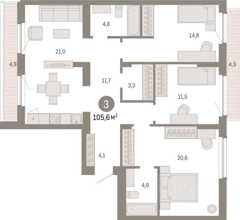 Продаётся 3-комнатная квартира в строящемся доме (Дом 1), срок сдачи: II-кв. 2028, общей площадью 105.6 кв.м., на 9 этаже. ''Квартал Лебедевского'' - новый проект компании ''Брусника'' в Заельцовском районе Новосибирска на ул. Георгия Колонды.
