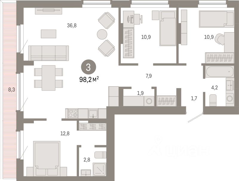 Продаётся 3-комнатная квартира в строящемся доме (Дом 1), срок сдачи: II-кв. 2028, общей площадью 98.2 кв.м., на 8 этаже. ''Квартал Лебедевского'' - новый проект компании ''Брусника'' в Заельцовском районе Новосибирска на ул. Георгия Колонды.