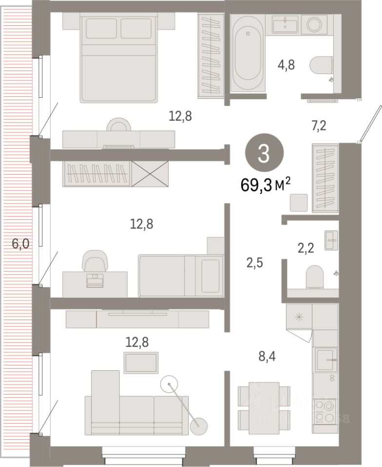 Продаётся 3-комнатная квартира в строящемся доме (Дом 1), срок сдачи: IV-кв. 2028, общей площадью 69.3 кв.м., на 3 этаже. Новый жилой комплекс ''Город-на-озере'' от застройщика ''Брусника'' расположен в Дзержинском районе Новосибирска в границах ул. Ипподромской, ул. Фрунзе, Журинского спуска.