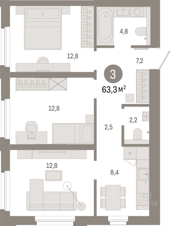 Продаётся 3-комнатная квартира в строящемся доме (Дом 1), срок сдачи: IV-кв. 2028, общей площадью 63.3 кв.м., на 8 этаже. Новый жилой комплекс ''Город-на-озере'' от застройщика ''Брусника'' расположен в Дзержинском районе Новосибирска в границах ул. Ипподромской, ул. Фрунзе, Журинского спуска.